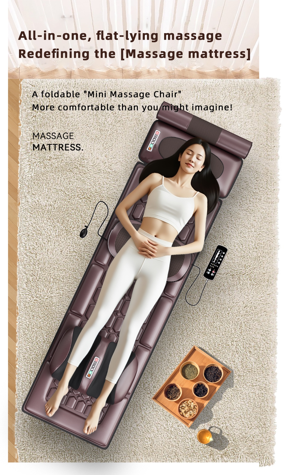 Massage type: relaxing, lymphatic drainage, rolling, vibrating