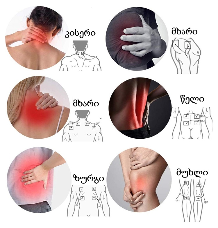 მასაჟის ზონები: კისერი, მხრები, ფეხები, ზურგი, წელი